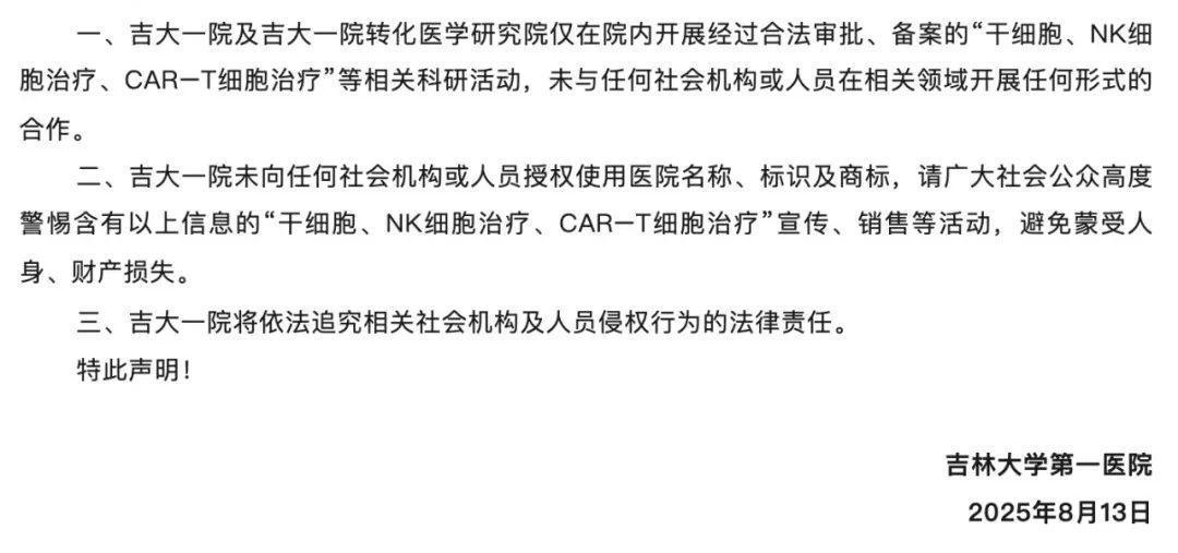 近期,某些社会机构及人员违法使用吉林大学第一医院(简称:吉大一院,别称:吉林大学白求恩第一医院)名称、标识及商标驰赢策略,并以吉大一院及吉大一院转化医学研究院名义驰赢策略,进行“干细胞、NK细胞治疗、CAR–T细胞治疗”等线上线下宣传推广及销售活动。对此驰赢策略,吉大一院发布《严正声明》,未向任何社会机构或人员授权使用医院名称、标识及商标;未与任何社会机构或人员在“干细胞、NK细胞治疗、CAR–T细胞治疗”等相关领域开展任何形式的合作。